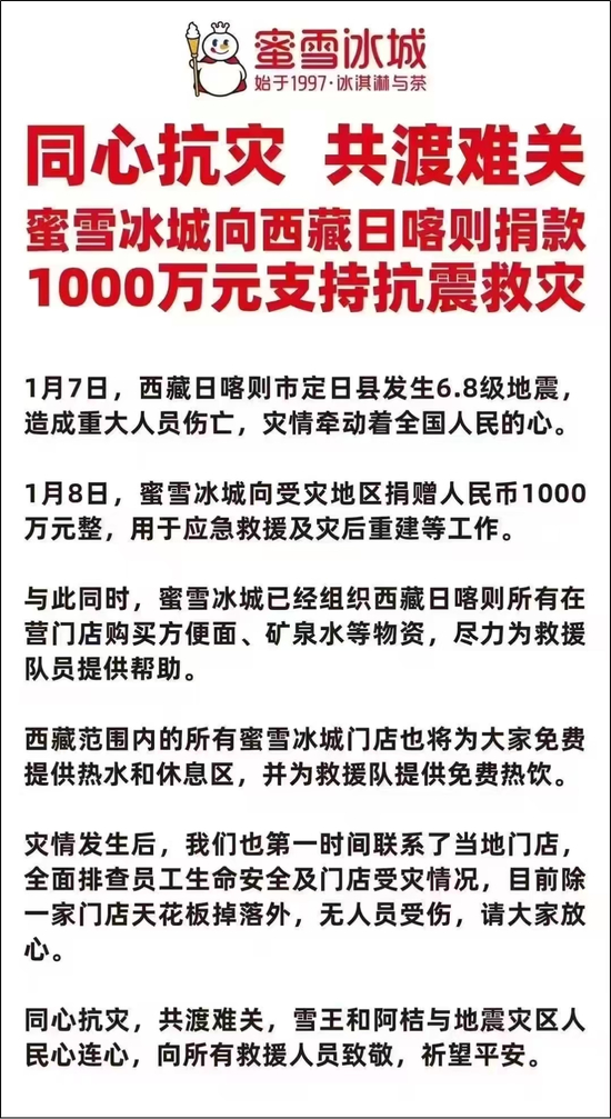1月7日,西藏地震,重大人员伤亡,他们也第一时间捐款救灾,希望和大家共渡难关。