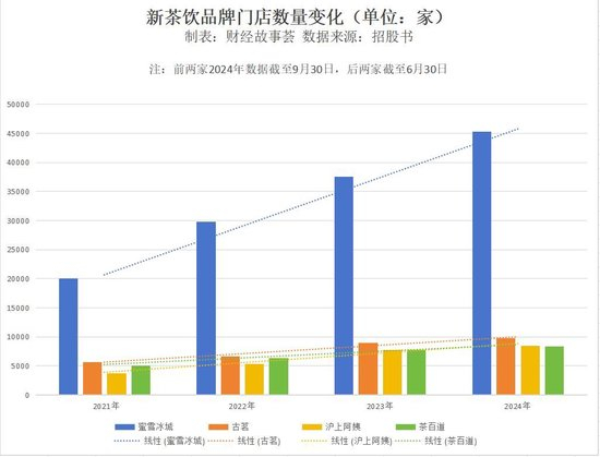 成立前10年,蜜雪冰城只开了1家店,从1000家到10000家,蜜雪冰城花了6年时间,再从万家门店增长到20000家,仅仅耗时两年。2024年,蜜雪冰城首次在港股申请IPO时,门店规模是36153家。今年元旦,蜜雪冰城给出的数据变成了45282家,而在同一赛道上,截至2024年前9个月,排在第二的古茗门店也没到万家。