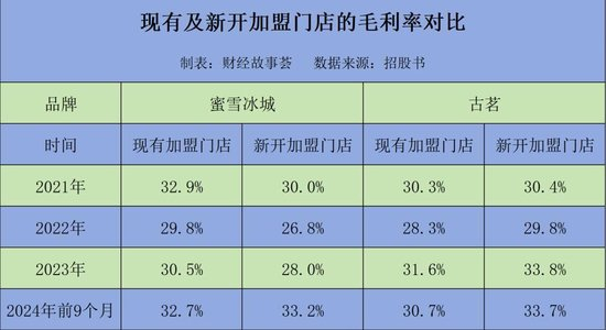 与此同时,蜜雪冰城新开设门店的毛利率长期低于原有加盟店的毛利率。2023年之前,两者相差2-3%,直到2024年上半年,新开设加盟门店才完成“逆袭”,比原有加盟店的毛利率微高出0.5%。