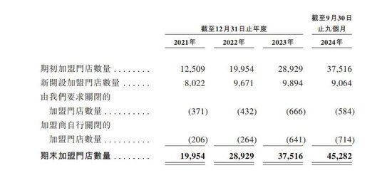 招股书显示,2021年至2024年前9个月,蜜雪冰城关闭的加盟门店数量分别为577家、696家、1307家及1298家。其中,加盟商自行关闭的加盟店数量持续增加,分别为206家、264家、641家、714家。虽然数量在增加,但关闭门店在其整体门店中的占比并不高。