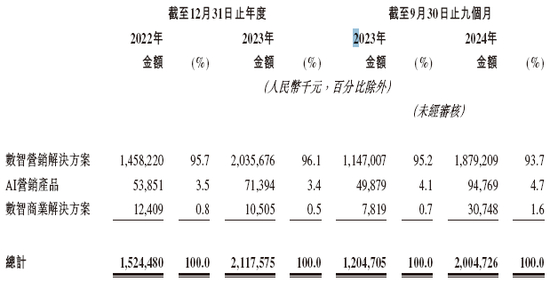 东信营销科技通过向客户提供数智营销解决方案及数智商业解决方案产生收入,也通过提供AI营销产品产生收入。数智营销解决方案,帮助客户提高其品牌曝光度、精准触达其目标消费者及创造更多的销售机会,通过最大化营销活动的曝光效果与营销效率,协助客户全渠道拓展其客户基础;数智商业解决方案深度聚焦于电商商家的发展需求,优化主流媒体平台上的流量运营,吸引用户并提高电商商家的销售转化。