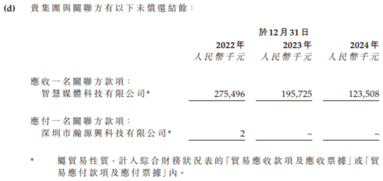 最新港股招股书显示,2022年-2024年,华曦达与智慧媒体产生的关联交易分别为5.75亿、4.35亿、2.68亿;2022年末-2024年末,华曦达对智慧媒体的应收账款账面余额分别为2.75亿、1.96亿、1.24亿。