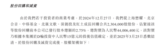 然而,此次港股招股书显示,由于若干投资者的商业考虑,于2024年12月27日,深演智能从上海懋耀、北京合音、中移基金、北广文歌、深创投及红土成长回购合共230.4万股股份,占紧接该等股份回购前本公司已发行股本总额的2.75%,总对价为4400.64万元,该对价乃根据本集团于D轮投资中15亿元人民币的投后估值确定,并于2025年3月25日悉数结清。
