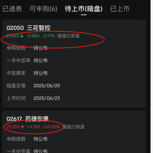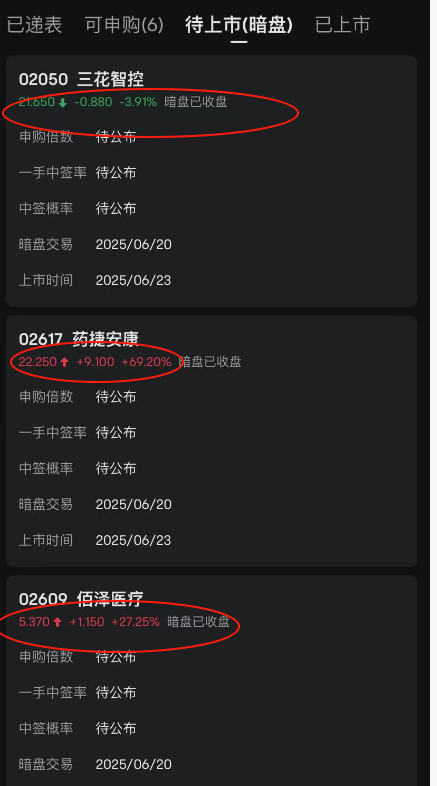 6月20日消息,三花智控下周一(6月23日)在香港证券交易所上市,今日暗盘交易跌3.91%。值得注意的是三花智控A股今日跌4.48%。此外,下周一港股上市的其他两只股票药捷安康暗盘大涨69%,佰泽医疗暗盘大涨27%。