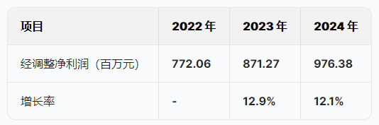 2024年经调整净利润为9.8亿元,同比增长12.1%,增速低于营收增速。主要原因是销售成本、营销费用、研发费用等成本费用的增长。2024年销售成本15,090.78百万元,同比增长18.5%,与营收增长同步;营销费用417.79百万元,增长27.5%;研发费用838.56百万元,增长23.9%。