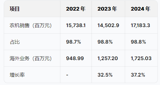 公司收入高度依赖农机销售,近三年占比均超过98%。2024年海外业务收入17.25亿元,同比增长37.2%,增速高于国内业务,显示出公司在国际化布局上的成效。但海外业务占总收入的比重仍较低,2024年为9.9%,未来还有较大的增长空间。