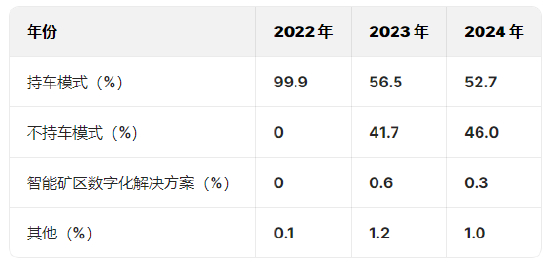 2022年,持车模式收入占比99.9%,几乎构成全部营收。2023年,持车模式收入占比56.5%,不持车模式占比41.7%,智能矿区数字化解决方案占比0.6%,其他占比1.2%。2024年,持车模式收入占比52.7%,不持车模式占比46.0%,智能矿区数字化解决方案占比0.3%,其他占比1.0%。