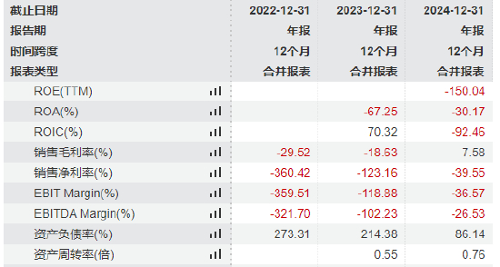 2022年净利率为-360.4%,2023年为-123.2%,2024年为-39.5%。尽管净利率亏损幅度有所收窄,但仍处于较高的负水平,主要受净利润亏损持续影响。