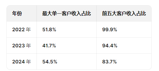2022年、2023年及2024年,来自最大单一客户的收入分别为3100万元、1.13亿元及5.37亿元,分别占收入的51.8%、41.7%及54.5%。同期,来自五大客户的合并收入分别占收入的99.9%、94.4%及83.7%。