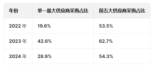 2022年、2023年及2024年,向单一最大供应商的采购额分别为4120万元、2.61亿元及4.44亿元,分别占采购总额的19.6%、42.6%及28.9%。同期向五大供应商的采购总额分别占采购总额的53.5%、62.7%及54.3%。