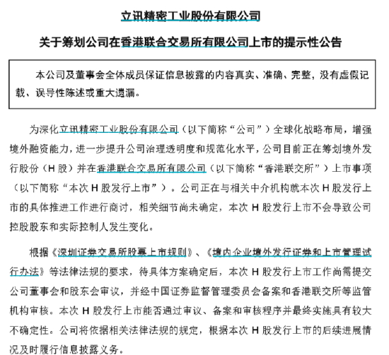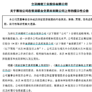 7月2日晚间立讯精密公告拟赴港上市,公司正在与相关中介机构就本次H股发行上市的具体推进工作进行商讨,相关细节尚未确定,本次H股发行上市不会导致公司控股股东和实际控制人发生变化。