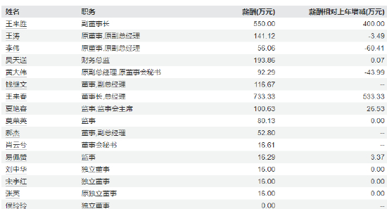 根据2024年报数据,立讯精密董事长、总经理及非独立董事王来春年薪高达733.33万,相比上一年增加了533.33万同比增长266.67%;副董事长及非独立董事王来胜年薪550.00万,较上一年增加400.00万,涨幅亦超过260%。