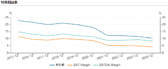 公司销售毛利率持续下降。近三期年报,销售毛利率分别为12.19%、11.58%、10.41%,变动趋势持续下降。