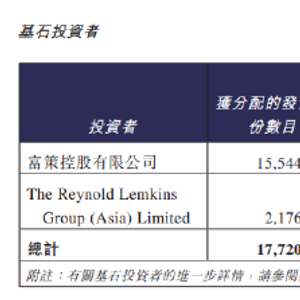 基石投资者方面,有富策控股有限公司和瑞凯集团,分别认购1554.4万股和217.6万股,分别占发售股份百分比为1.85%和0.26%,占全球发售後已发行股本总额百分比分别为1.85%和0.26%。即富策控股斥资约1.5699亿港元,瑞凯斥资约2197万港元。