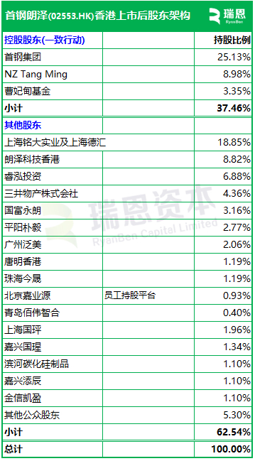招股书显示,首钢朗泽在上市后的股东架构中,一致行动人士包括首钢集团、NZ Tang Ming、曹妃甸基金分别持股25.13%、8.98%、3.35%,合计持股约37.46%。