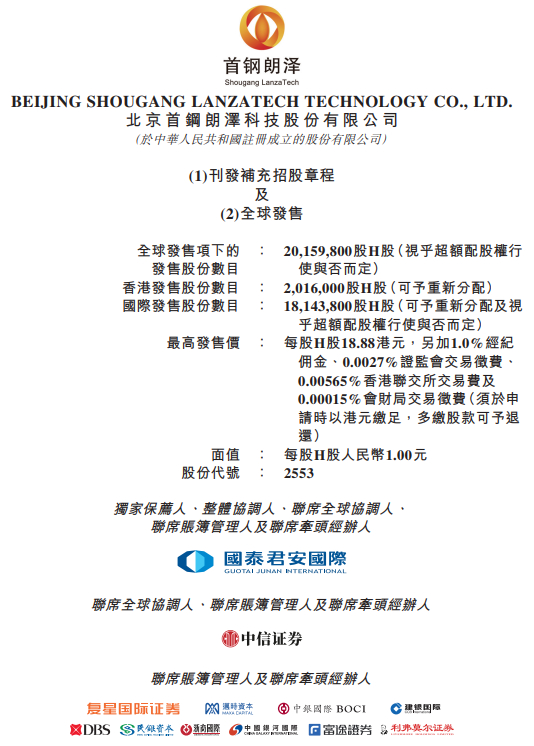 首钢朗泽(02553.HK)上周临时延迟IPO后,再次重新招股,同时刊发补充招股章程。