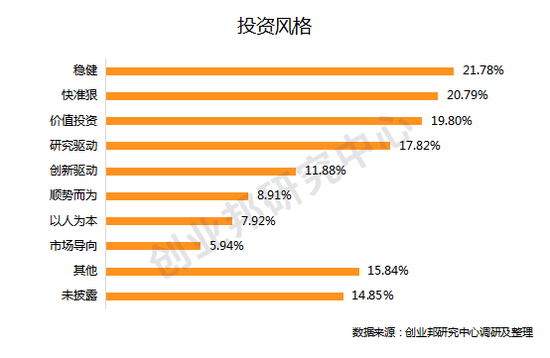 调研数据显示,参评投资人的投资风格自评中,稳健投资排首位,占比21.78%;20.79%的投资人倾向于快速寻找项目、精准分析并敢于承担一定风险押注;19.80%的投资人则表示看重企业的发展潜力和未来长期价值,与企业共同成长。