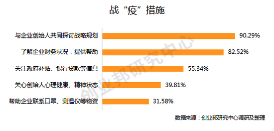 调研数据显示,90.29%的参评投资人都在积极和被投企业进行战略规划研讨,对风险进行梳理把控。其中,现金流的重要性再度被强调——82.52%的参评投资人会尽早了解被投企业的财务状况,未雨绸缪,对症下药;55.34%的参评投资人帮助企业对接银行等机构,以便获得短期低息贷款;部分投资人会关心创始团队的的身心健康、提供抗疫情物资等。