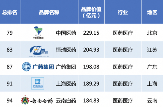 在《2020中国品牌500强》上榜品牌中,医药医疗行业共有55个品牌上榜,中国医药229.15亿元的品牌价值位列行业第1名、总榜单的第79名。恒瑞医药、广药集团和上海医药分别以204.93亿元、198.08亿元和189.29亿元位列行业的2至4位。