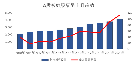 近年来A股被实施ST(特别处理)的股票呈现不断增加的趋势,2020年为近年来的高峰。今年A股已有13家上市公司被暂停上市,15家上市公司退市,数量创历史之最。