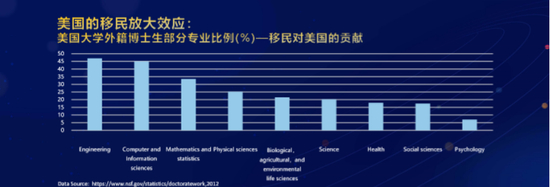 我们就会对比一下中国的人才池子和美国的人才池子,从数量、质量上,我们会比较中国的年轻人口中,拥有大学以上学历的人口数,还有一个因素要考虑,美国不光是利用了本国人才池子,美国有一个巨大的移民效应,相当一部分的创新或者创业是来自于移民,它可利用的人才池子是本国人口的放大了一定的倍数。