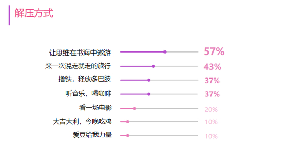 调研数据显示,30位上榜女性创业者中有21位目前工作“压力一般,在适当范围内”,占比70%。同时,通过调研我们了解到,读书、旅行、撸铁、听音乐已成为她们当下最喜欢的解压方式,其中读书占比最高,为57%,从她们推荐的书籍来看,科幻小说《三体》备受推崇。