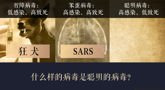 最笨的病毒我称其为“智障病毒”,它的特点是低感染、高致死。典型代表就是狂犬病毒,致死率接近100%,但感染率很低,这样的病毒最后很可能会被消灭,并不会获得与人类共生的好机会。