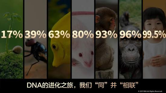 大家觉得我跟一颗草的基因相似度有多高?17%。我跟一只苍蝇的基因相似度有多高?39%。我跟一条鱼、一只老鼠、一只猴子、一只猩猩的基因相似度,分别是63%、80%、93%、96%。而我和你之间的基因差别只有0.5%。