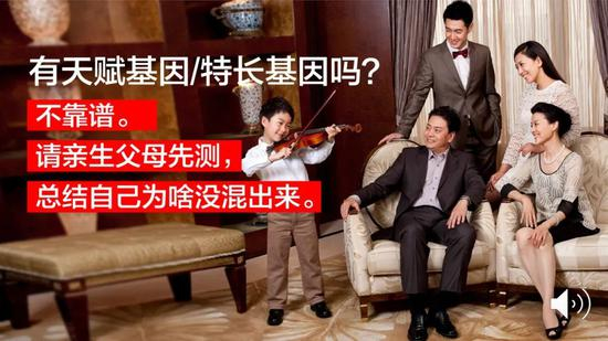 遇到这样的问题,我一般先会反问:“孩子是不是你亲生的?如果孩子是你亲生的,你们先总结一下自己为什么没有那样的天赋呢?”这种想法只不过是把望子成龙和望子成凤,包装成今天的高级手段来“基因算命”了。