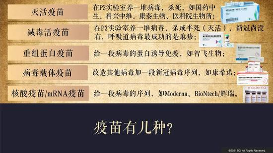 第一种是大家比较熟悉的灭活疫苗,在P3实验室里养一堆病毒,先杀死再提纯,再装到每一个注射剂里。目前,中国已经批准上市的新冠灭活疫苗有:国药中生、科兴中维、康泰生物、医科院生物所。
