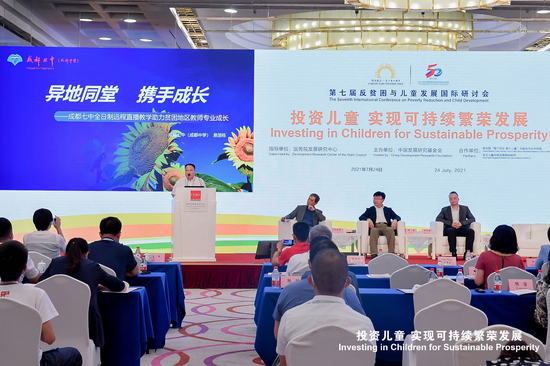 7月24日,第七届反贫困与儿童发展国际研讨会在北京举行,大会的主题为“投资儿童 实现可持续繁荣发展”。在大会第四单元——疫情下的教育信息化与教育公平的讨论中,成都七中校长易国栋分享了成都七中全日制远程直播学校,助力贫困地区教师专业成长的案例。