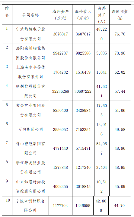 2021中国跨国公司100大按照跨国指数排序,前10名的企业分别是宁波均胜电子股份有限公司、洛阳栾川钼业集团股份有限公司、上海韦尔半导体股份有限公司、联想控股股份有限公司、紫金矿业集团股份有限公司、万向集团公司、青山控股集团有限公司、浙江华友钴业股份有限公司、山东如意时尚投资控股有限公司、宁波申洲针织有限公司。其中宁波均胜电子股份有限公司居首位,达到76.76%。2021中国跨国公司100大的平均跨国指数为15.07%,比上年降低1.03个百分点,共有52家公司跨国指数高于平均跨国指数。详见下表。