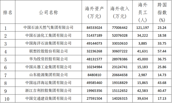 2021中国跨国公司100大海外营业收入排前10位的企业分别是中国石油天然气集团公司、中国石油化工集团公司、中国海洋石油集团有限公司、联想控股股份有限公司、华为投资控股有限公司、中国兵器工业集团有限公司、山东能源集团有限公司、中国远洋海运集团有限公司、浙江吉利控股集团有限公司、中国交通建设集团公司。联想控股股份有限公司、山东能源集团有限公司、中国远洋海运集团有限公司首次进入前10位。详见下表。