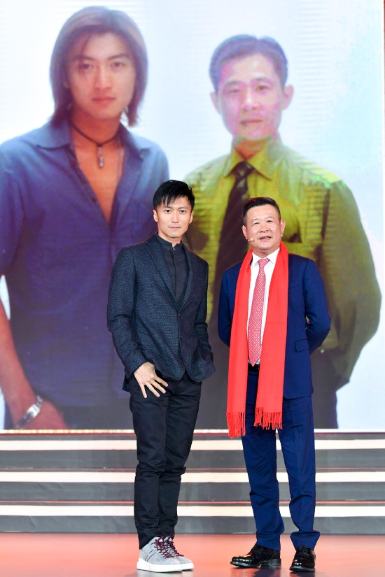 李艾:今天有位老朋友,为了庆贺您拿奖,给我们发来了一张旧照,我们一起看一下。这时候大家应该准备好掌声了,我们要有请这位陪伴了特步20年的老朋友来到现场,掌声有请谢霆锋。
