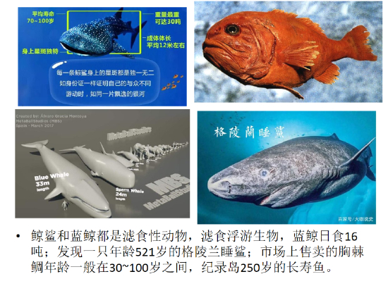 我们还知道海洋中的生物生命,生物寿命都很强的,很长的,大家可以看这个图上,红红的那条鱼,红红的那条鱼。它能够进入到生活时间呢,是三十岁到一百岁,有进入到两百五十岁的。而市场上大家如果去买了这条鱼,吃一条鱼,那都是几十岁以上的。你想想在几十年时间当中,他们都生活在海洋当中。那么也就是说,他们每天摄食的物质,统统被封存在他们体内。因此,保护这些生物呢,就显得非常的重要。