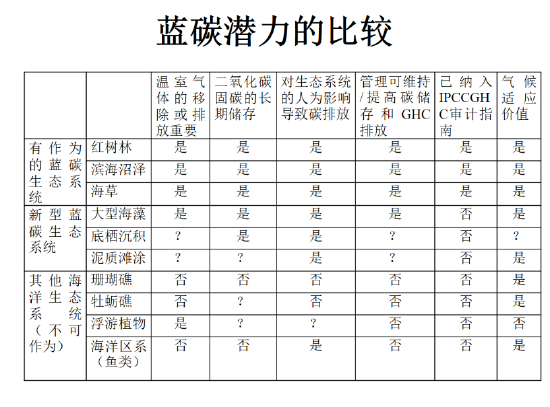 我们可以看到这个表,这个表上呢,进行了比较,比较了蓝碳潜力有多大。我们可以看到,无论是红树林,这个滨海湿地,还是海草,在各个方面,各个领域当中都是正能量的,都能够起到非常好的蓝碳的捕获、固定、封存的作用。