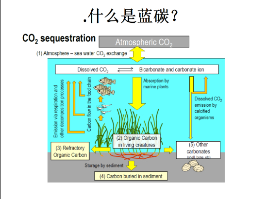 什么叫蓝碳呢?蓝碳实际包括两个部分,一部分就是海洋里的碳,一部分是海洋带来的碳。总的来说是通过来表示吸收,固定和储存在海洋中的碳。
