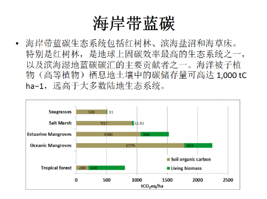 海洋带蓝碳生态系统包括红树林、滨海盐沼和海草床。特别是红树林,是地球上固碳率最高的生态系统之一,以及滨海湿地蓝碳碳汇的主要贡献者之一。海洋被子植物有一个高等植物七十七度,对土壤中的碳储量可高达一千吨碳每公顷,远高于大多数的陆地生态系统。大家可以看到下面的表上,就表示了他们之间的差异。