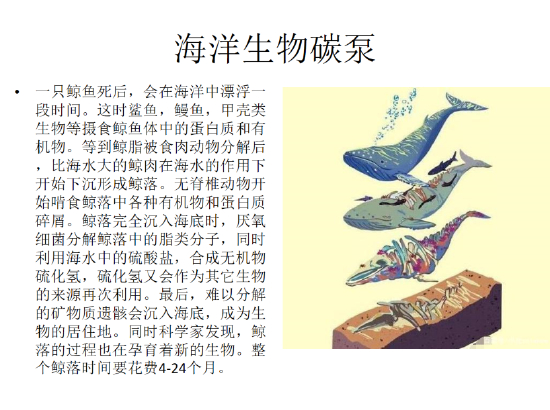 浮游植物尽管微不足道,但至少生产地球上50%的氧气和吸收370亿吨二氧化碳(40%)。那么这样的鲸鱼在他生活过程中,如果比如说他要排泄,那么排泄出来物质呢,是论吨的,就是鲸鱼的排泄物。这样的排泄物进入水体以后,就逐渐的往下沉,沉到海底去。还有鲸鱼死掉以后呢,也要往下沉,我们可以看到一只鲸鱼从它死亡到沉降的时间,差不多要花费四到二十四个月,就是四个月到两年的时间。