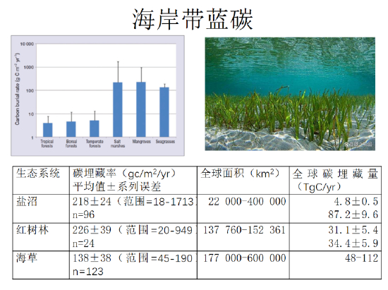那么刚才谈到海洋蓝碳,我们来看海洋带蓝碳,海洋带占全球海洋总面积的7%,但贡献了全球海洋25%的初级生产力,86%的渔获量和97%的生物多样性。海岸带红树林、盐沼和海草床等海岸带线生境,仅占海洋总面积的2%,但其捕获和储存的碳量占海洋沉积物总量的50%。