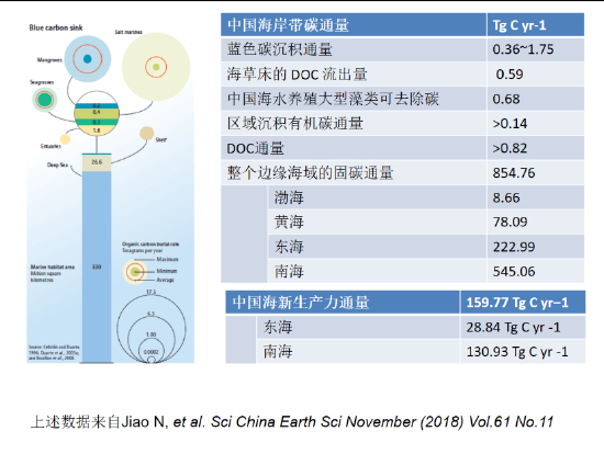 那么我们可以看到这个图,这个图上显示的是焦念志院士在2018年发表的文章,我们可以看到这里头所有的蓝碳的数量,以及我们在渤海、黄河、东海、南海各个地方边缘海的固碳的通量有多少,我们可以看到南海的量是非常之大的。
