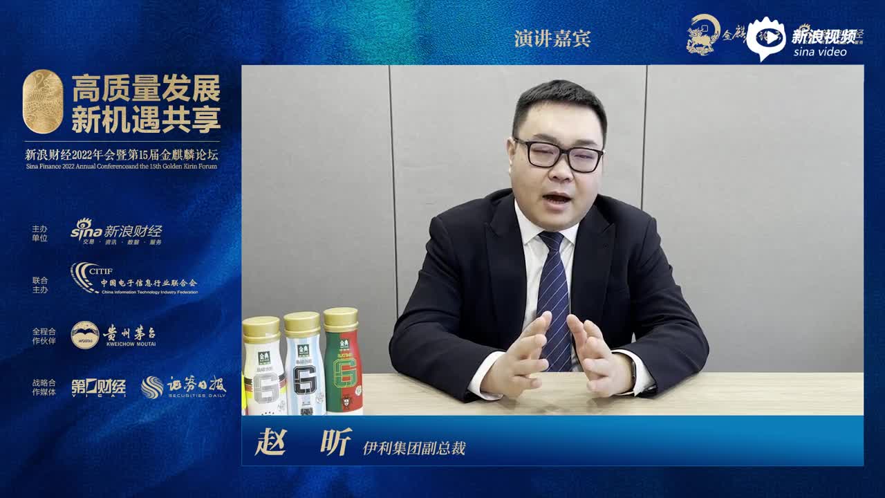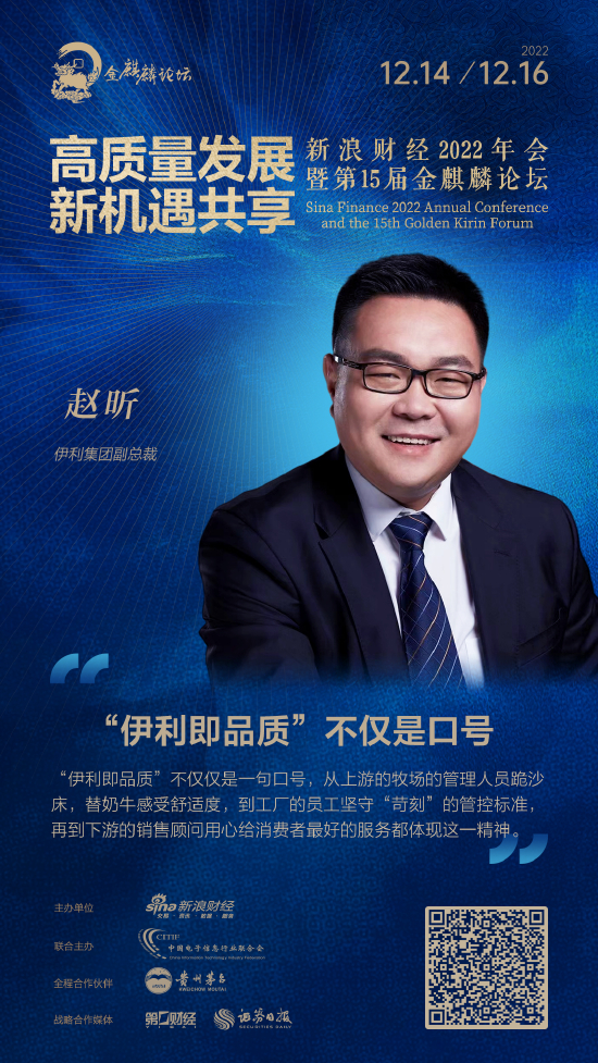 12月14日-16日,新浪财经2022年会暨第十五届金麒麟论坛举行,本届年会的主题为“高质量发展、新机遇共享”。伊利集团副总裁赵昕出席并演讲。