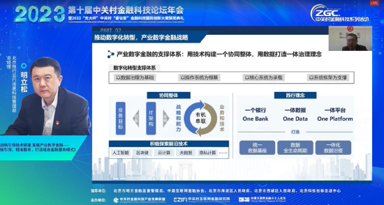 北京银行总行信息科技管理部总经理明立松在12月14日“由点到面”打造场景生态圈——场景金融专题论坛发表题为:“战略引领技术赋能,发展产业数字金融——科技引领、精准服务,打造组合金融服务模式”演讲。他指出:银行数字化转型,需要从顶层设计和指导,将金融场景生态建设与开放银行战略同步布局,以战略合作构建开放生态,把金融服务、数据服务嵌入第三方,以场景为载体,将银行业务扩展到社会生活场景各方面,为客户提供更全面、精准的金融和非金融服务。促进产融生态的完善,需要多方联动,共同努力。北京银行以开放银行技术平台为基础,重点围绕智慧教育、智慧医疗、智慧园区、数字政务、数字文创等领域,打造具有北京银行特色的场景生态体系,延伸数字服务触角。北京银行明确把数字化转型作为全行转型发展的核心战略,走好数字经济时代“二次创业”之路、实现高质量发展,持续加大数字化转型的资源投入,实现转型战略加速落地。