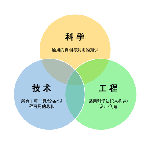 在《谈谈科学、科学与技术的关系》这篇文章中,则给科学、工程和技术用了一张图来描述这三者之间的关系。
