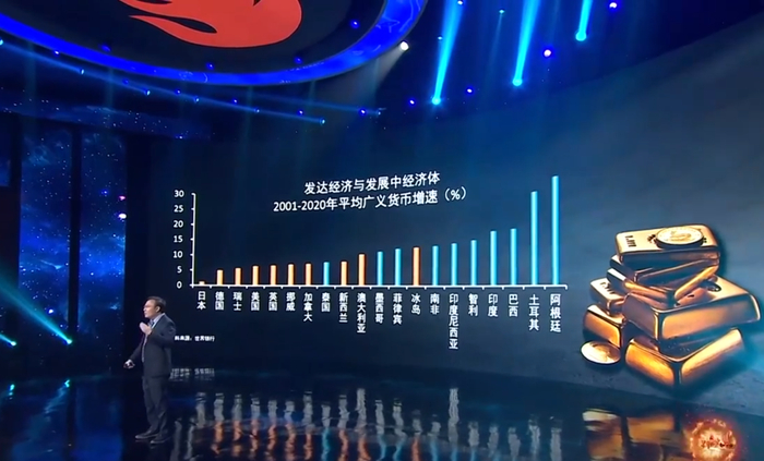 任泽平还在现场讲起来货币历史。最早全球货币体系是贵金属本位,因为金银储量和生产有限,所以不存在货币超发。1945年美国作为二战后最大的战胜国,制定了“美元-黄金本位”,也就是布雷顿森林体系,美国承诺1美元兑35盎司黄金,世界各国货币与黄金挂钩,于是美元成为全球主要储备、结算、交易货币。但是到了后来,美国国力下降,加上美国不断超发货币,法国等国家开始怀疑美元能否兑换黄金,开始把美元储备大量兑换成黄金运回国内。面对超发货币带来的无法兑换黄金困境,美国前总统尼克松在1972年宣布美元不再与黄金挂钩,于是,人类社会进入到信用货币时代。什么是信用货币?就是以前印钞票受黄金约束,现在不用了,想印多少印多少,于是全球正式进入货币超发的大时代,世界各国都开足马力印钞票。因为政府筹集收入无非三种方式,增税、发债和印钞票,增加税收很难通过,发债是要还的,而印钞票既不要还,还无声无息的向民众收了税,超发货币也是一种变相税收,“铸币税”,所以世界各国越来越依赖超发货币来征收铸币税,这就导致了过去几十年全球资产价格和通胀水平的大幅上升。