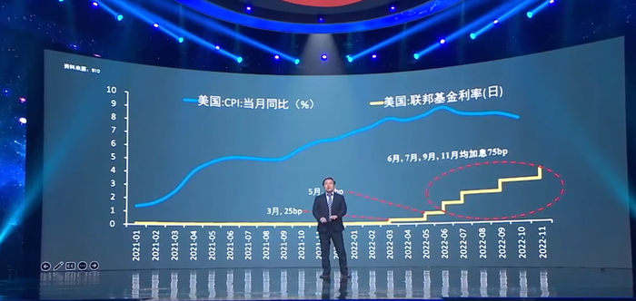 任泽平指出,2022年,全球金融市场最让人惊心动魄的大事件是,美联储以40年来的最大力度加息收紧货币,一年时间加了7次息,其中4次加息75BP,堪称史诗级加息周期。