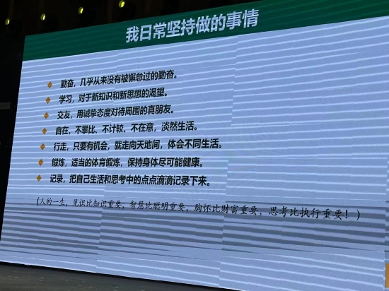 因为要讲自己的故事,所以我也就列了一些我自己所做的事情,我日常坚持的几个要素大概就是这些,第一是我比较勤奋,当然我刚才说我的勤奋不是乱勤奋,我的勤奋一定是认为我觉得这件事情经过我现在的认知水平,我觉得我值得去做以后的勤奋。