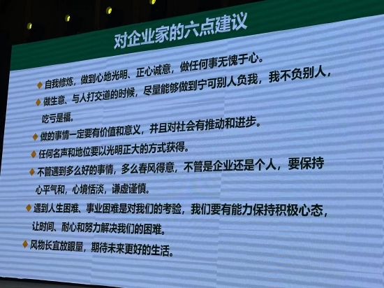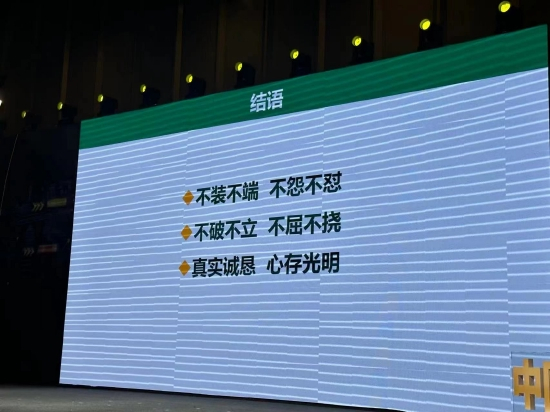 好,这个就不说了,这个刚才说过了,最后几句话,这不是对我的总结,而是我觉得做人应该达到这种境界,我也在往这个方向努力,做人尽可能不装不端,不怨不怼,不破不立,这是做事业的,上面是指态度,下面是指勇气,下面是指道德,真实诚恳,心存光明。