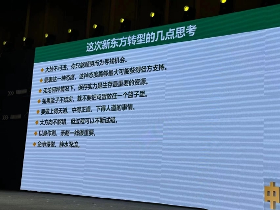 但是第10条我要说一下,领导人是最重要的第一生产力,也就说整个企业不管你有多少的资源,不管你有多少的创新,如果领导力,第一就是具备充分决策能力的那个领导人,如果说他本身形成了障碍,那这个企业是不可能有任何希望的,所以我就新东方的董事会问我说你做直播,你有什么样的感觉的时候,我说我已经做了一年半的直播,而整个新东方的管理干部中间唯一玩直播的就是我一个人,所以我说,我认为这是第三次商业革命,给我这个机会让我来做,所以你得尝试,所以我后面,后面有这个,有这么一个,这是新东方转型的几点思考。