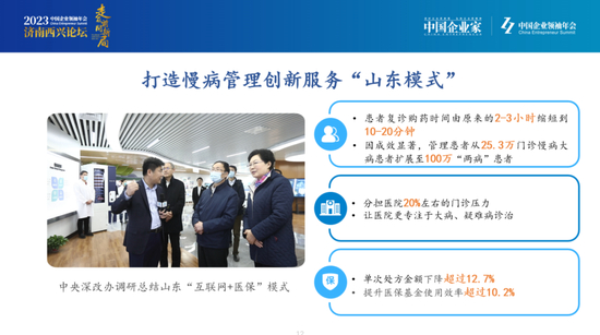4.我们打造的慢病管理创新服务“山东模式”,总结了山东的互联网+医保的模式。通过这样的平台,为患者节省了大量时间,而且也为医院承担了20%的门诊压力。